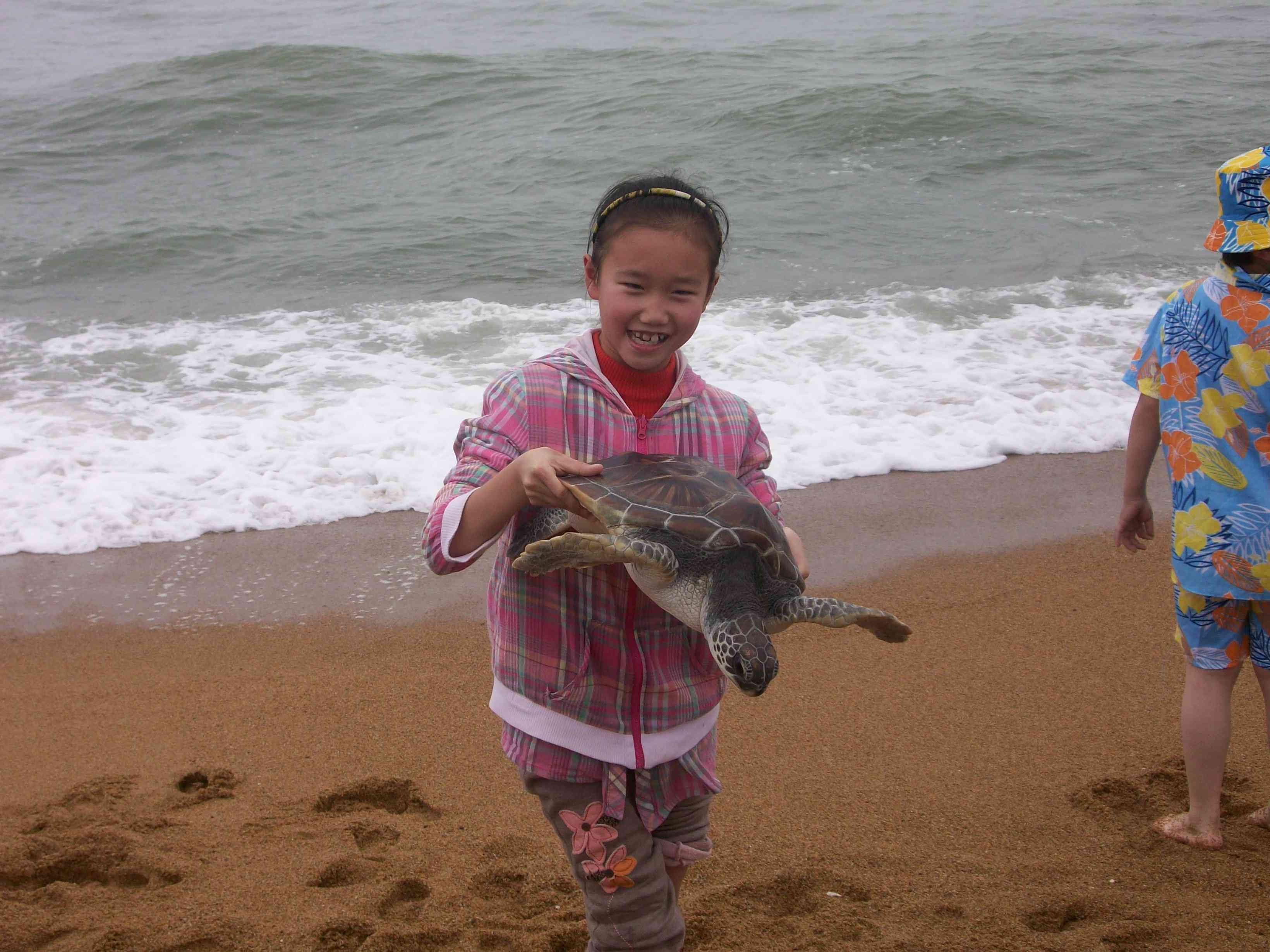 下了船,我们在海边休息了片刻,观赏着人们尽情玩耍﹑嬉戏的画面。在那边,一个勇敢的小女孩竟然拿了一个大海龟,一向勇敢的我也觉得挺害怕的。其实,动物都是人类的好伙伴,它们不会轻易的伤害人类。看似可怕地海龟其实是一种温顺的动物。听说龟是一种长的很慢的动物,那么大的海龟得有多大的寿命呀!我多想把这只海龟带回家呀,可是我知道不能因为我一个人一时的快乐,而伤害海龟一家的幸福,可能它还有需要照顾的父母﹑子女吧!
