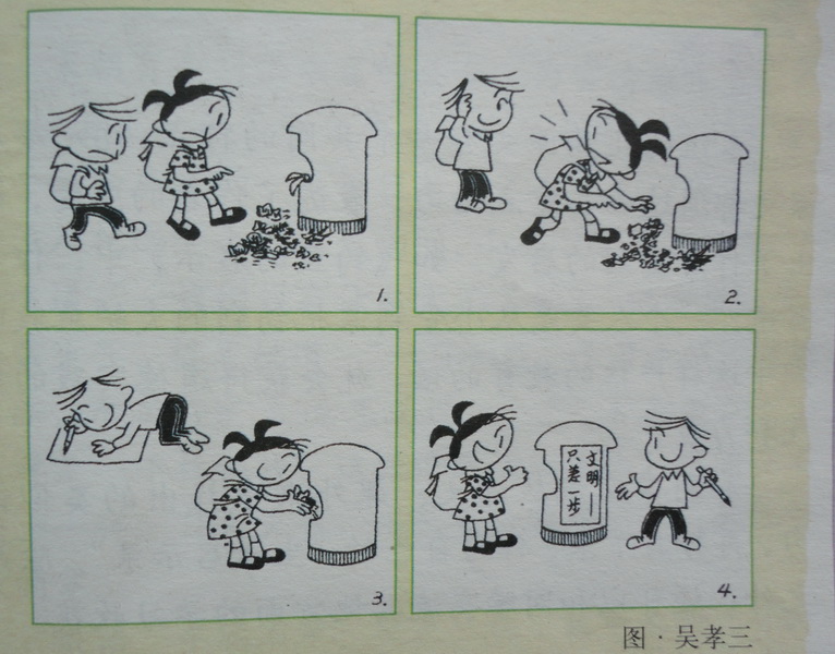 "不能老这样,总得想个办法才行啊!"小女孩认真地说"对,你说得对,总不能这样。那该怎么办呢?"小男孩认真地琢磨着。"有了!"小男孩高兴得喊着,"写条标语吧!"