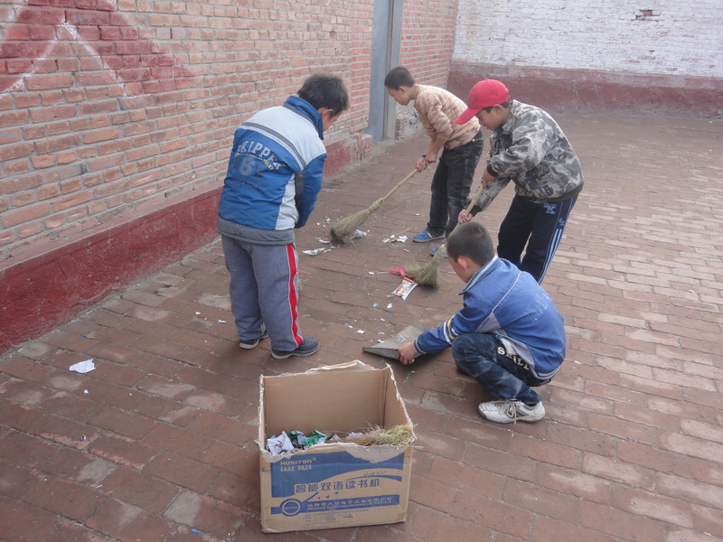 "是啊!是啊!"小男孩盯着这些垃圾说,"像这样,我们的生活环境能好吗?"他边说边生气地叉着腰。"我们先把垃圾捡到垃圾桶里再说吧。"说着两个小孩弯腰把垃圾扔入垃圾桶内。