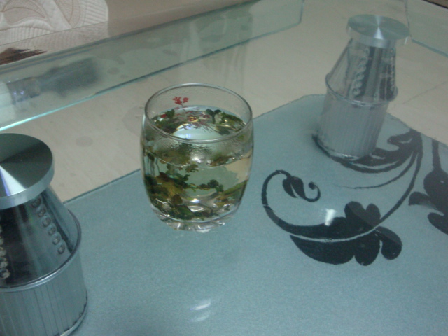 慢慢地,随着茶叶的舒展,茶水的颜色也随之变换着——就有如一片绿叶,从刚开始的浅绿变为后来的凝重的绿。这绿色里,盛开着几朵白色的菊花,花瓣儿在水里微动着。一杯茶也算是一幅画。