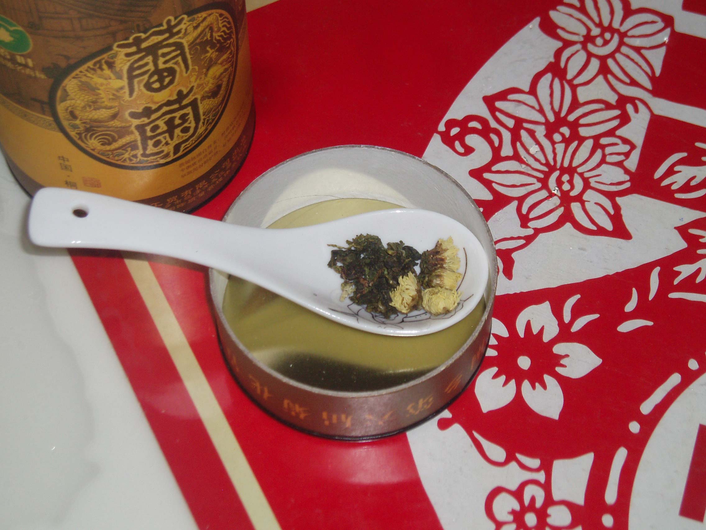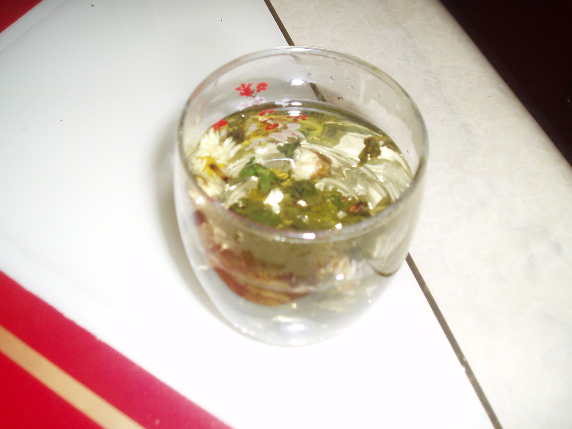 先要将茶杯用温水冲一下,冲过之后的水杯摸起来微热,很舒服。接着,为了不让茶叶混入手气、杂味,要用勺子将茶叶放入茶杯内,因为家里有干菊花,所以我也放了几朵。然后,将开水倒进放了茶叶的杯子里,这才是第一冲,目的是为了冲洗茶叶上的灰尘,顺便也使茶杯有了一股淡淡的茶香味。