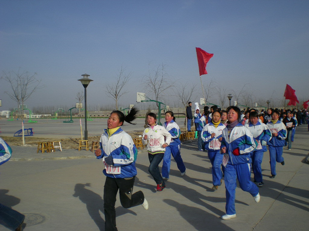 随着一声枪响,女生们争先恐后的向前冲去,虽然天气冷,但是为了能真正发挥出自己的实力,大部分同学都脱却了厚外套,外面只穿了校服或毛衣上阵。