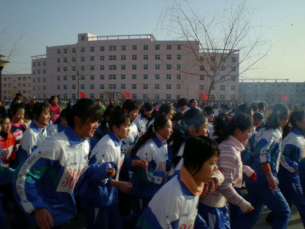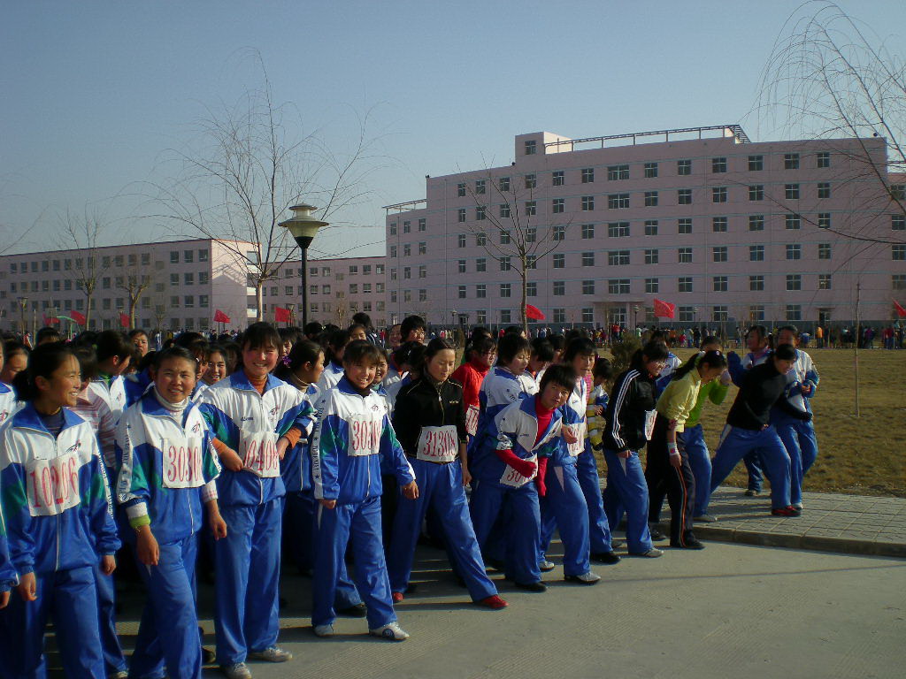 2007年12月30日,我们学校举行了一年一度的冬季"迎春杯"越野赛。尽管天气特别冷,但是同学却非常高兴,场面隆重而热闹。看,这是正准备参加比赛的女子队,比赛马上就要开始了,你看,她们有的已做好了准备,有的朝着我开心的笑呢!