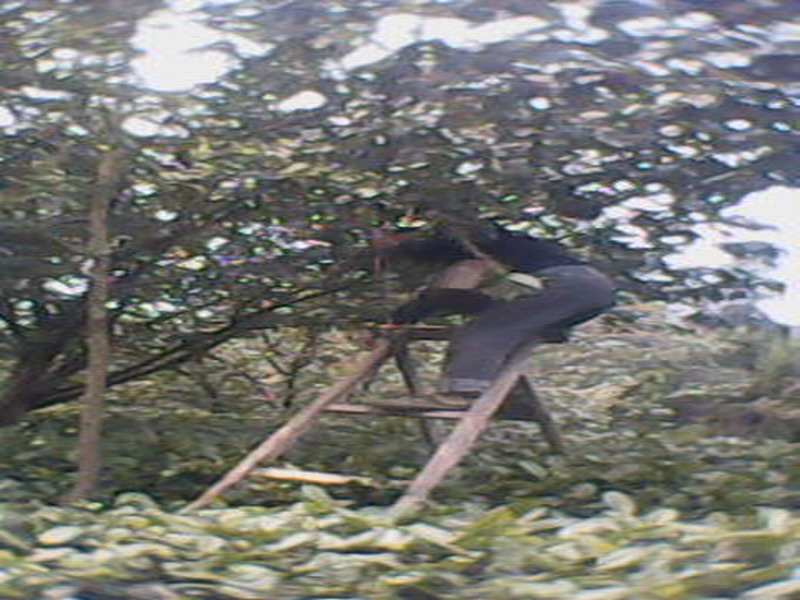 到山上。哇塞!每个田里都有一个或两个人在摘樱桃。高高的樱桃树下搭着一个梯子,放在两行茶道中间支撑着,这样比较安全。他们虽说是为了挣钱,但也是为了让更多人尝到好吃美味的樱桃吗?看到这里,我有一种冲动,就是自己去摘,帮他们分担些。
