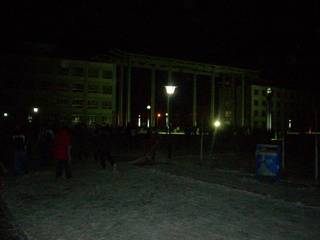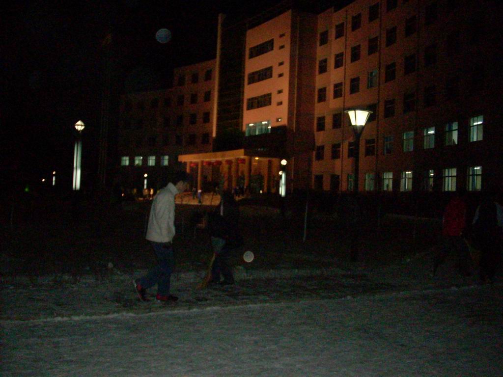 看这是一幅清晨天还未亮的景象,跑校生还未到的景象,有许多住校生早早起床,拿上扫帚在主要的校园交通路段上清扫积雪,以防跑校生滑倒,是爱的奉献,是美的表现,是和谐的体现。啊!充满了爱的校园,及时有难行的雪道也变成了易行的跑道。