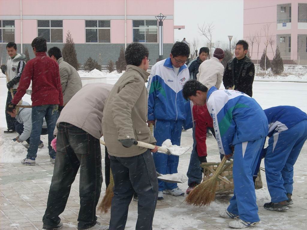 虽然很累,但老师亲临现场指导工作给了同学们很大的安慰.雪地里,忙碌的师生,和美丽的雪景构成了一道和谐美丽的风景线.这样看来,其实扫雪也挺好的。
