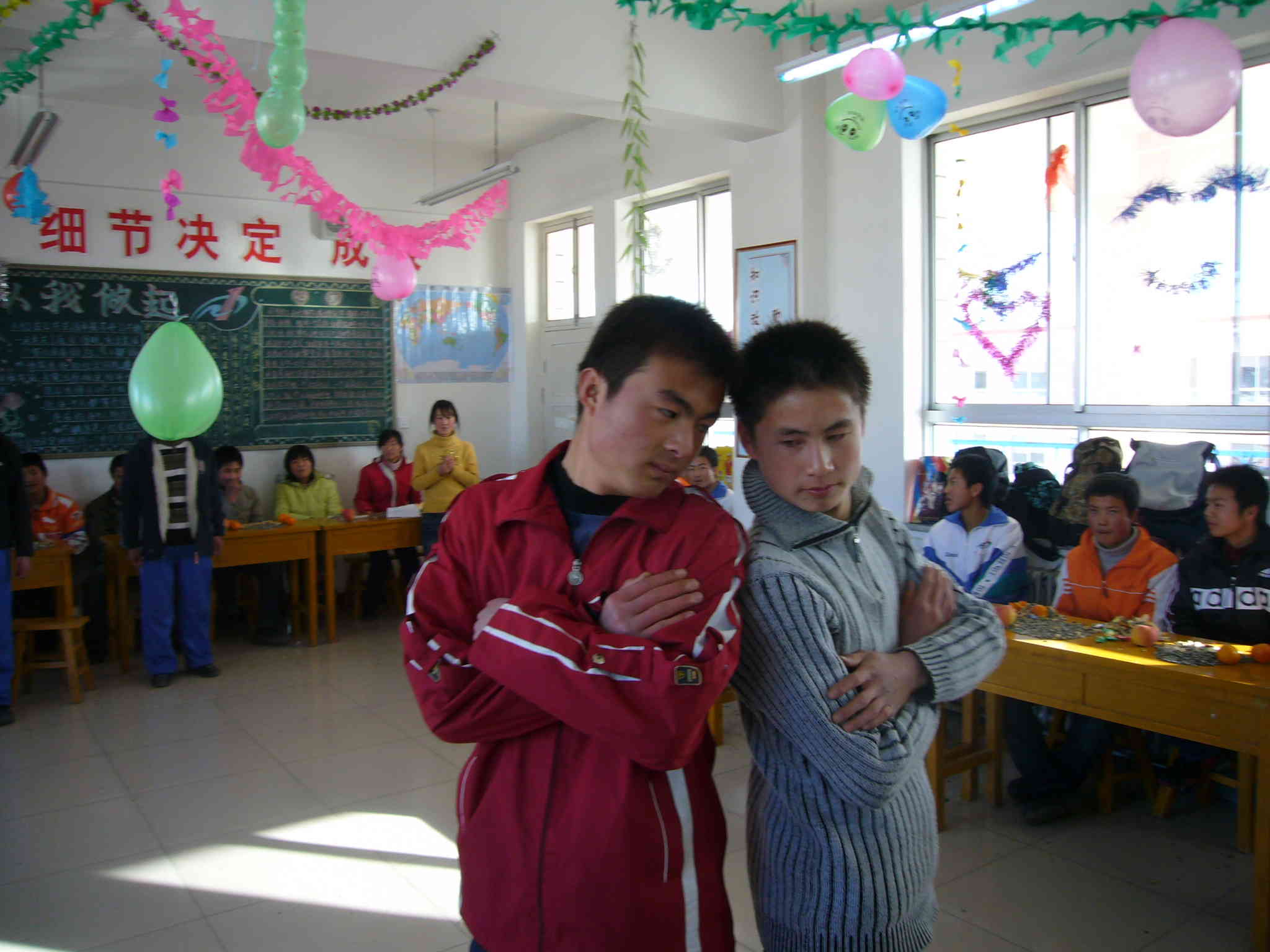 我们班的欢乐气氛感染了兄弟班同学的加盟,看!他们也情不自禁的走进我们班,为我们的联欢会注入了新的活力和朝气。他们的精彩表演也赢得了每一位观众的掌声,让我们携起手共同迎接神圣的高考,有竞争才会有动力。