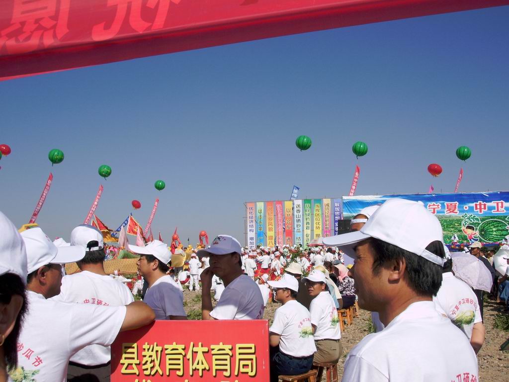 它为整个中卫市的发展带来了一个非常好的机遇,能给瓜农带来非常好的经济效益,同时也拉动了相关的一些产业,所以全市全县人民都动员了起来。看, 这是中宁县教育体育局派来的助威代表团,他们也来为宣传硒砂瓜贡献自己的力量了,当然还有当地瓜农们自己表演的各种庆祝活动。