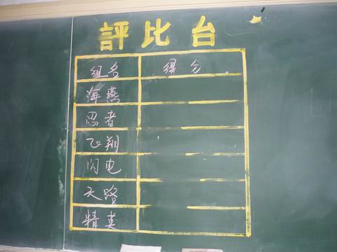 一走进教室,最引人注目的那就是讲台上的黑板了。黑板是毛玻璃的,黑板上的右边是用黄色颜料画的评比台,上面写有我们班六个学习小组的组名:海燕组、忍者组、飞翔组、闪电组、天路组和精英组。你们说我们班的组名是不是很有气魄呀!