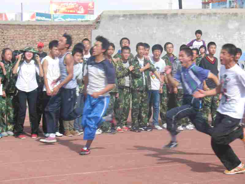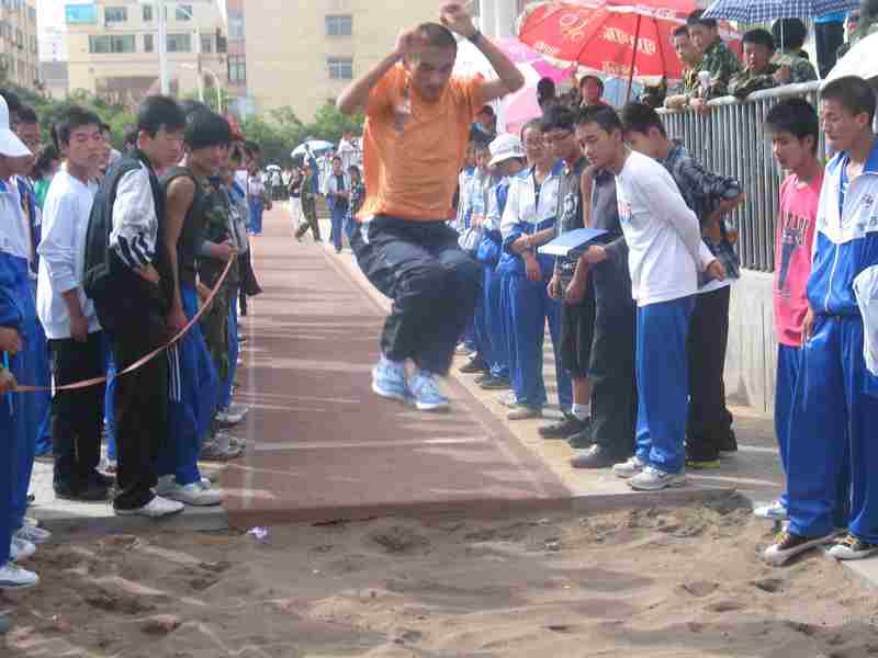 在跳远赛场上,只见一名运动员疾速助跑,快到界线时,纵身一跃,身体前倾,在空中划过一道优美的弧线,双脚落地,一个不错的成绩,同学们为他欢呼,鼓掌。这股热闹的气氛鼓舞了比赛的每一个运动员,又一个身轻如燕的运动员上场了,他先慢慢地跑起来,跑到中间位置时,他用力踩了一上"油门"快速腾起,又一个优秀的成绩展现在人们面前,现场又一阵欢呼,还未比赛的运动员个个信心饱满,整装待发。