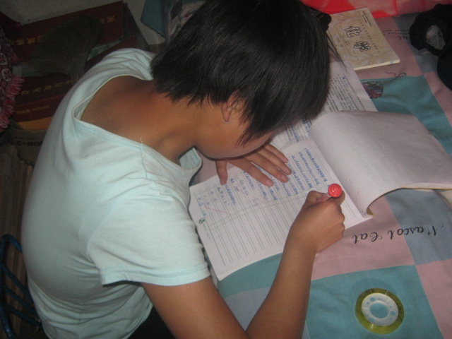 自从,父母过世以后,每到星期天我和姐姐就去拉水,然后一起洗穿脏的衣服。姐姐还有一个爱好,就是爱思考问题。每天,我已有不会做的题,我就会问她,他便会先读题,然后审题,画图思考,得出结论后,细心的为我讲解问题直到我会做为至。看,姐姐又开始思考问题了。
