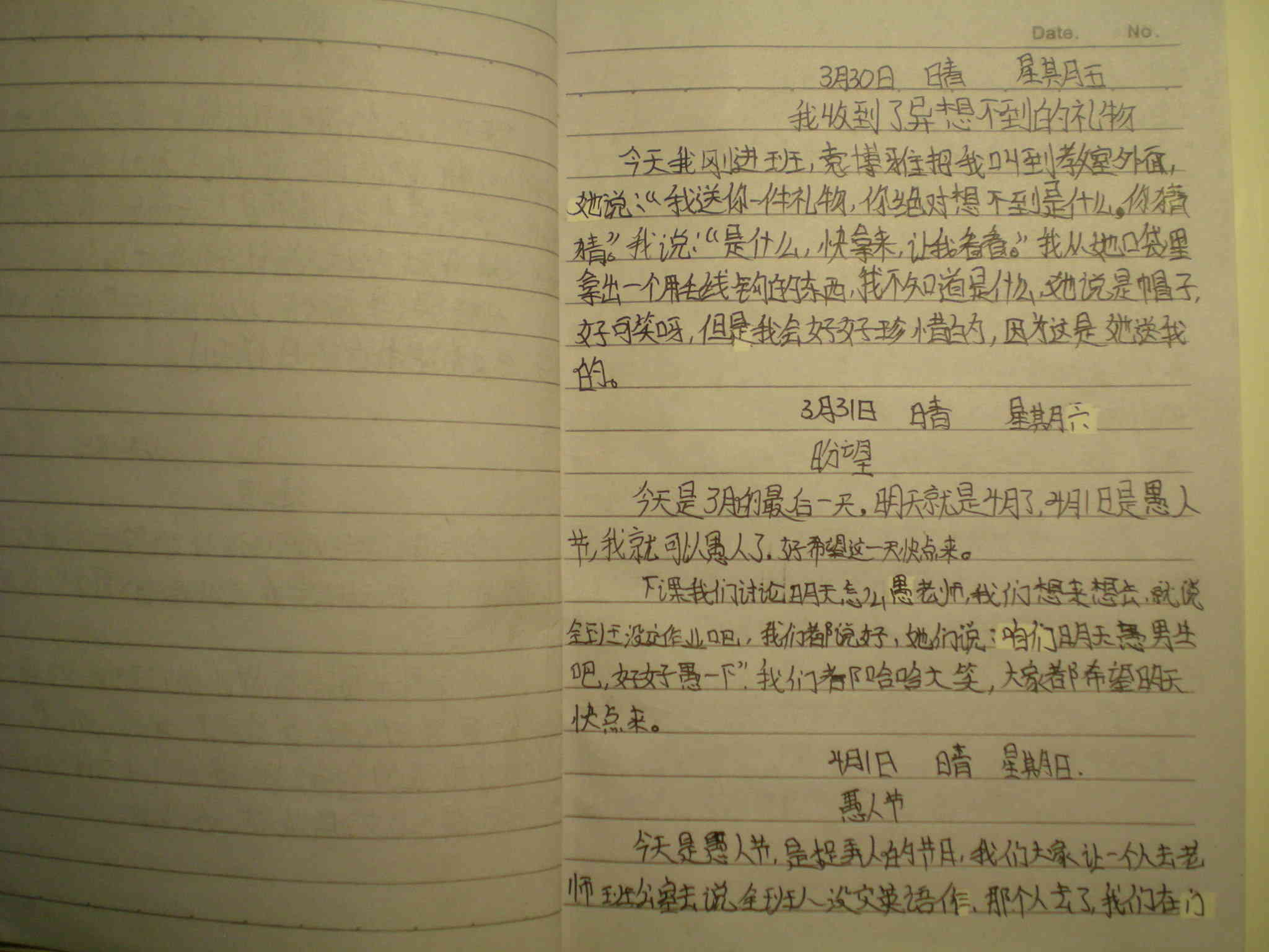 这个笔记本是我的命根子,我每天都会写一件有意义的日记,长大了慢慢看自己成长的历程。每当我写日记时,我会找一个别人发现不了的地方,或是把本遮得风雨不透,决不准别人看到。因为里面有我的心事,不想与别人分享。我经常在日落后写日记,写前总要深思一下,想想哪件事有意义。