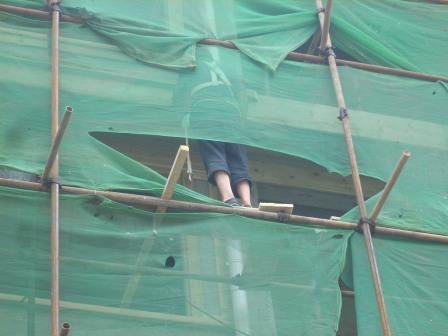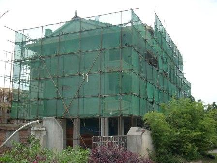 仔细一看,绿色围网里高高地施工架上,有两名工人正一锤一锤地敲打搭建好支架,整个工地一片繁荣景象。