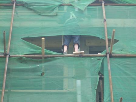 虽然到了下午,但气温仍旧酷热难耐,但工人们仍认真在做自己的工作,似乎没有感觉到热?几个背木料的工人,汗水早已浸透了他的衣服,劳动间歇,他和工友们才喝上几口水,便又投入了紧张而有序的工作中。