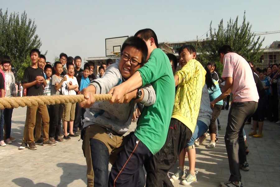 随着裁判老师的一声令下,大家都把身子往后蹲,拼命的拉。同学们拉得大汗淋漓,筋疲力尽,但都没有丝毫的放弃。老师在旁边拼命的加油,同学们也在大声地鼓励。