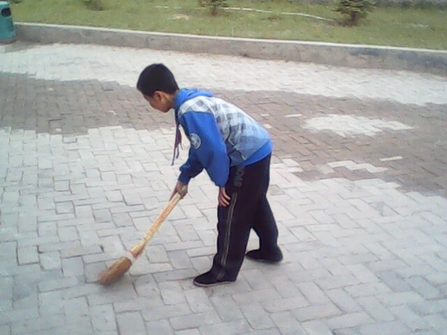 有一次,老师让我们几个男同学到校门前打扫卫生,他立刻拿着卫生工具去扫了,我们也跟了过去打扫起来,可是扫了一会儿,我就没耐心了,借上厕所溜走了,悄悄跑到操场上和其他同学打起了篮球,等我玩累了,走过去看见只有他一个人在打扫,这时我的脸有点发烧了,不好意思的的和他一起扫了起来。而他什么也没说,只是一个劲儿的扫着。