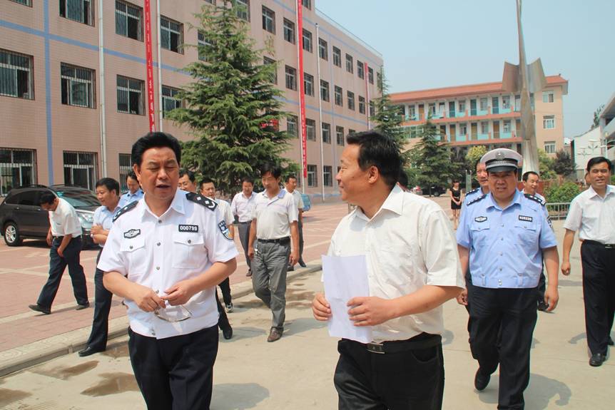 6月18日上午省安委会一行来槐芽初中检查验收"部级平安畅通县"创建工作。省公安厅交通总队副总队长杨金平、省公安厅交通总队事故处处长张经纶、省工业信息化厅调研员任树清、市交警支队副支队长陈广涛、市交警支队事故科杜宝琨等十多位省市领导来校检查验收,眉县县委常委、副县长、县交安委主任杜勇社,县委常委、政法委书记王春社,教体局局长杨广利等领导陪同。