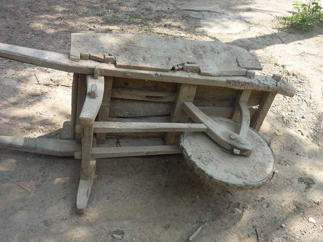 独轮车只有一个轮轮后有两个腿支撑着,一边不用的时候放着,轮是圆的,轮中心有压轴装置,上边有一个车厢,还有两个长长的手柄是推的地方。别小看这么简单的农具,在生活中用处可不小哦。