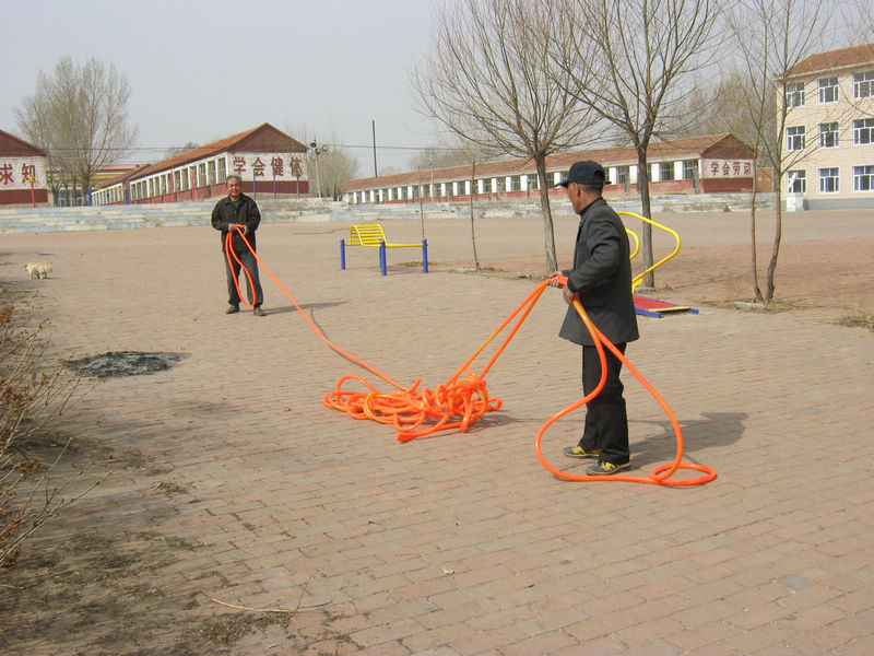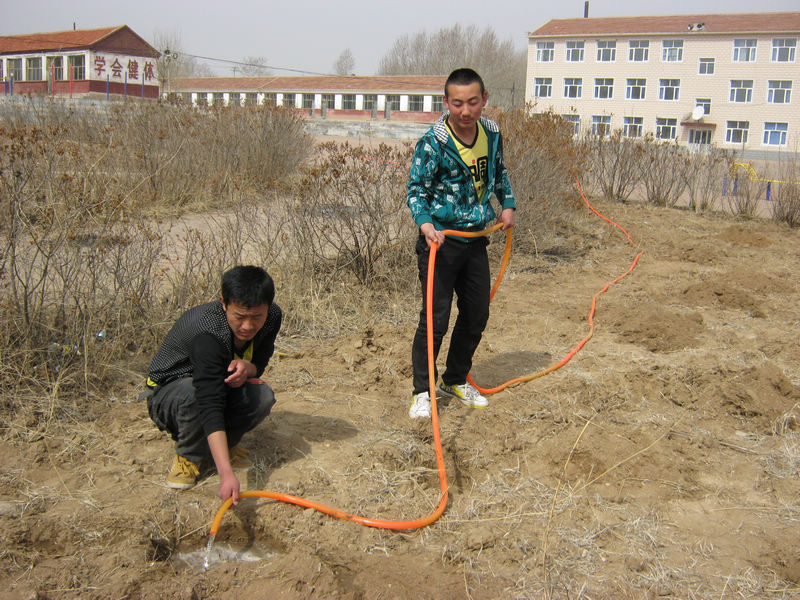 树坑挖好后,还不能马上栽种,因为我们这里在这个季节是个干旱的季节,没有足够的水,小树是成活不了的。必须先把树坑给够水,才能再栽种。这不,我们学校的老师正在正理水管,准备从很远的水井中给引水呢。