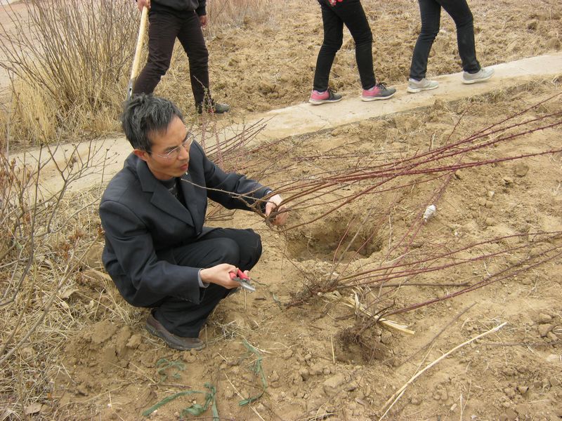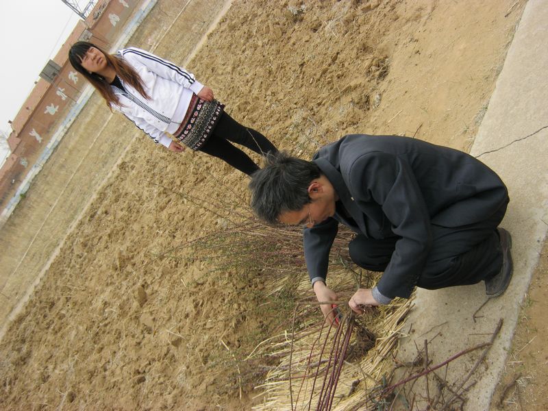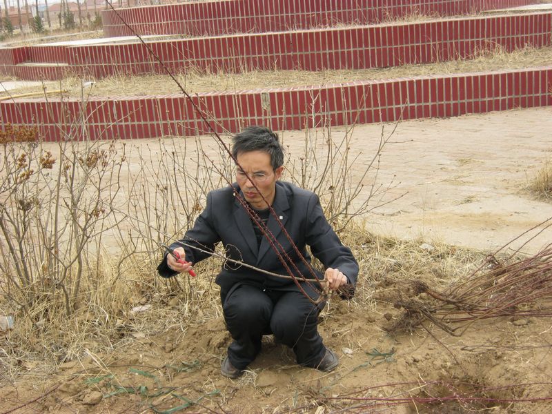 他长时间蹲在地在上,手中的剪刀不断发出的响声,把一位年轻的女教师吸引过来。经过询问才也知道了其中的道理,还不断提醒着生物老师小心小树的刺,因为她刚才不小心被刺了一下。生物老师笑着说:"没事,抓好根部就没有问题,它的根部是没有刺的"。又低下头修剪着树苗了。