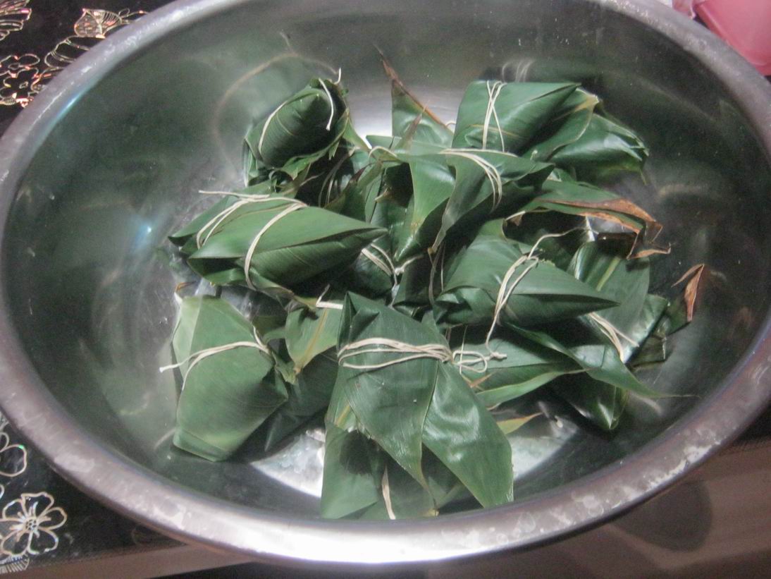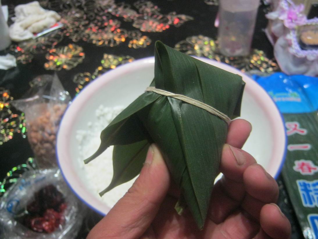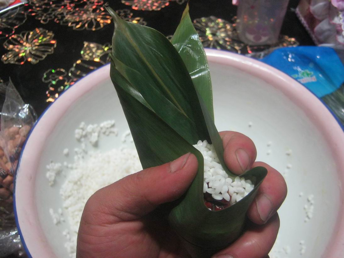 我和姐姐看了好几遍才慢慢的学会了,包粽子首先把粽叶卷成一个漏斗样子,然后里面先放米,再放一颗红枣,还可以放其他东西,比说花生、葡萄干等等,只要是你喜欢吃的都可以然后再放一些米,不能太多,要不然就包不严了。