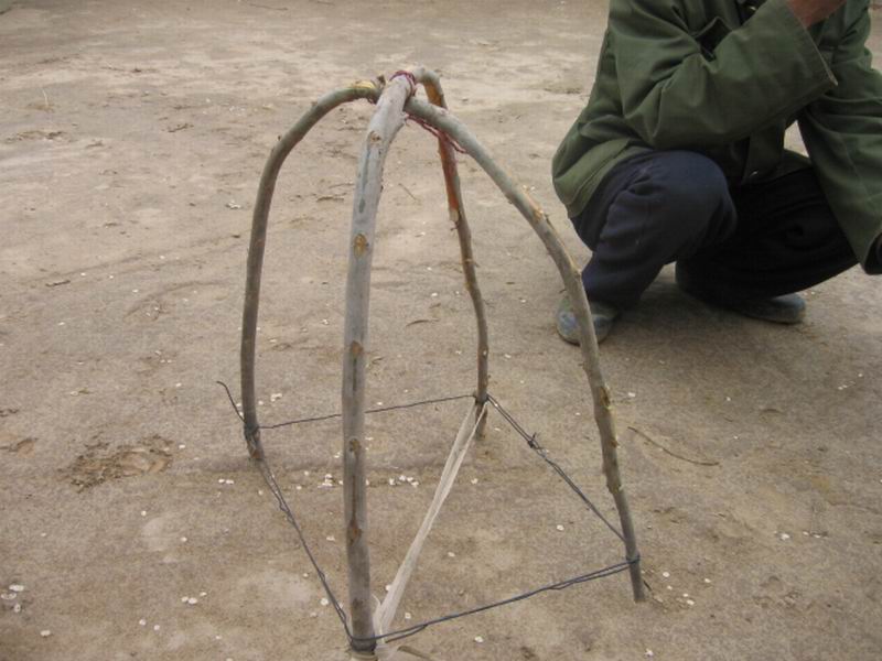 制作过程:首先将细木棒曲成弯形,用绳子将这两个弯形的细木棒十字交叉固定。