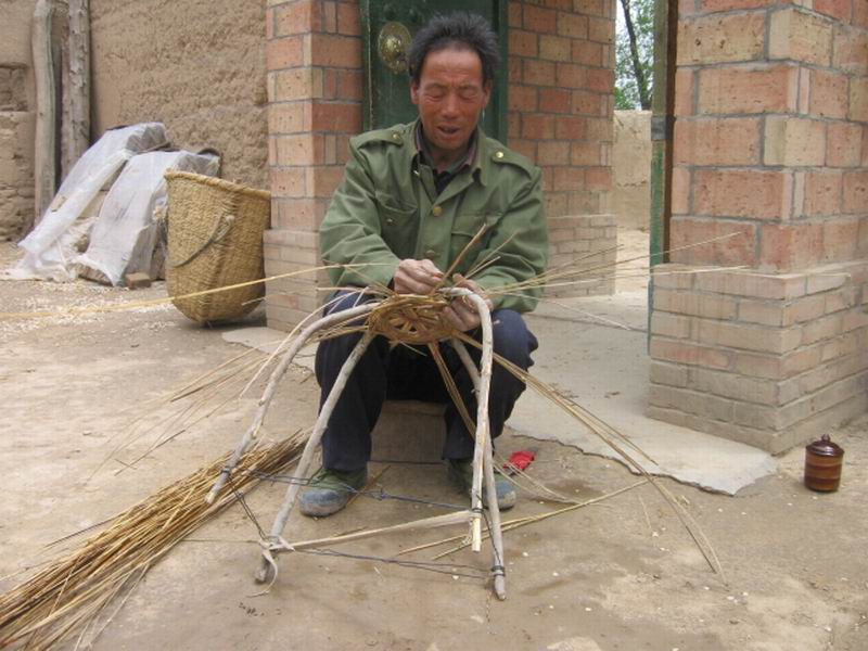 然后用绳子把编好的小底固定在背篼戈上,再用竹条一根一根地从下底往上编,只到编成为止。