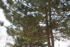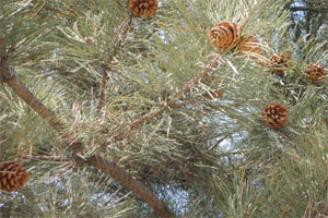 松树的叶子象针一样,一簇簇向外伸长着,每一个都尖锐有力好象有一种精神支撑着它们。松树的果实也很有特点:它是一个椭圆形的,分成一层层的花瓣。果实躲藏在由"稻草"摆好的家里,就好象是保护房子的战士和风雨的遮阳伞、挡雨棚。还是那种力支持的它们的信念,去保护果实。