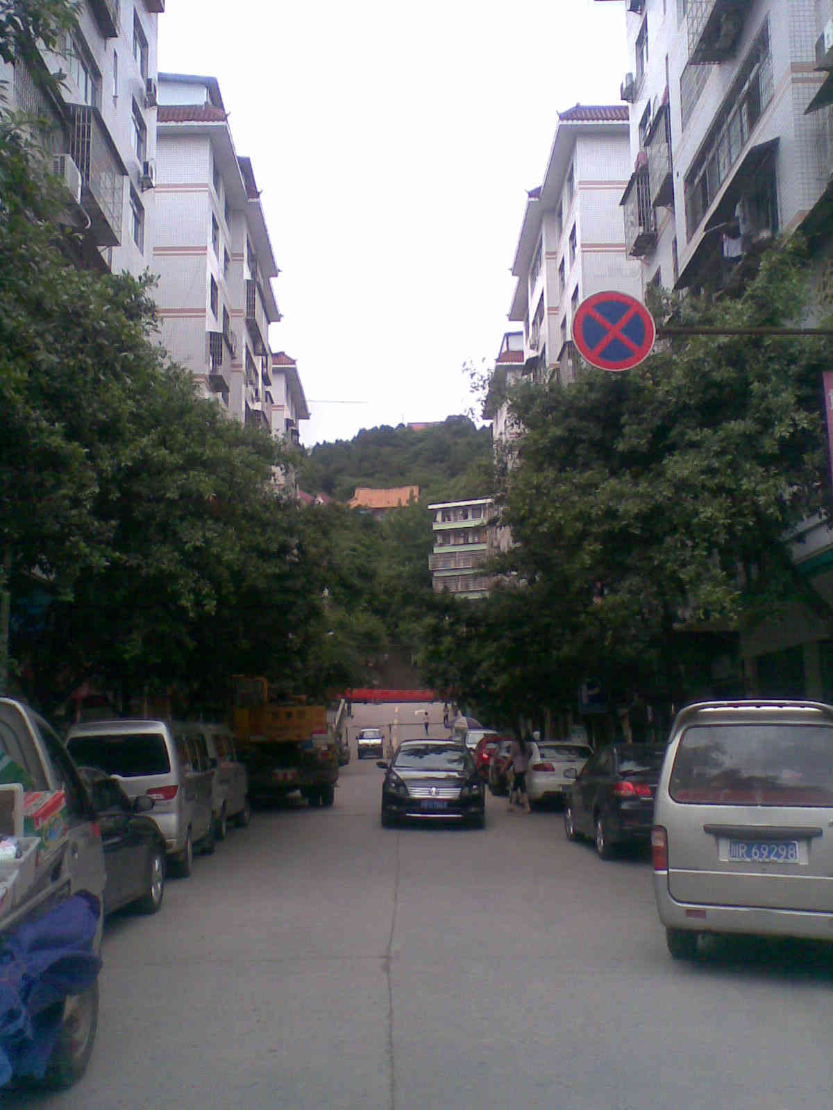 这是南充市西充县城里的一个角落,大大小小的车辆有序的停靠着,迎面开来一辆黑色的小轿车,在那遥远的后面有一座美丽的山——化凤山
