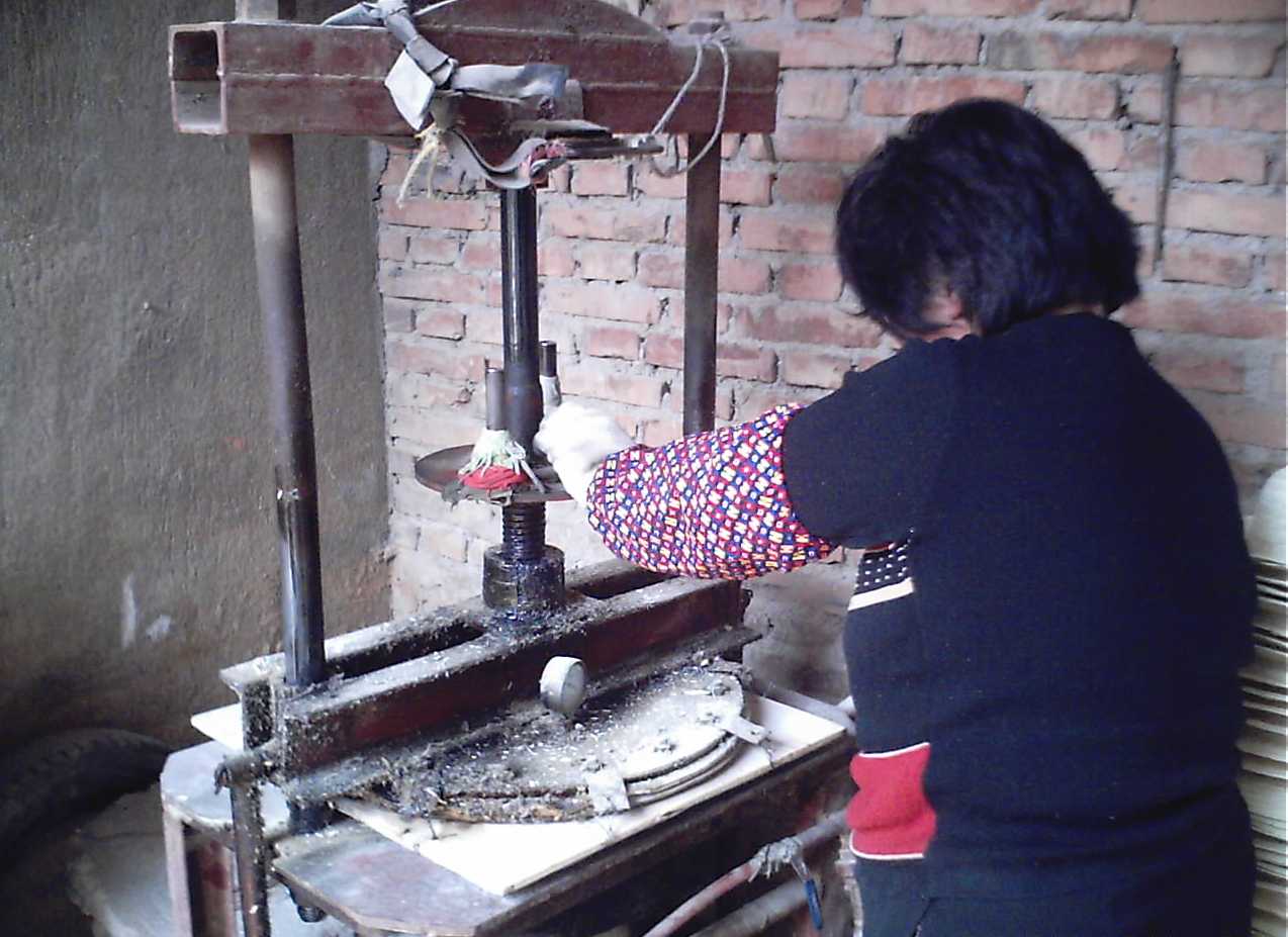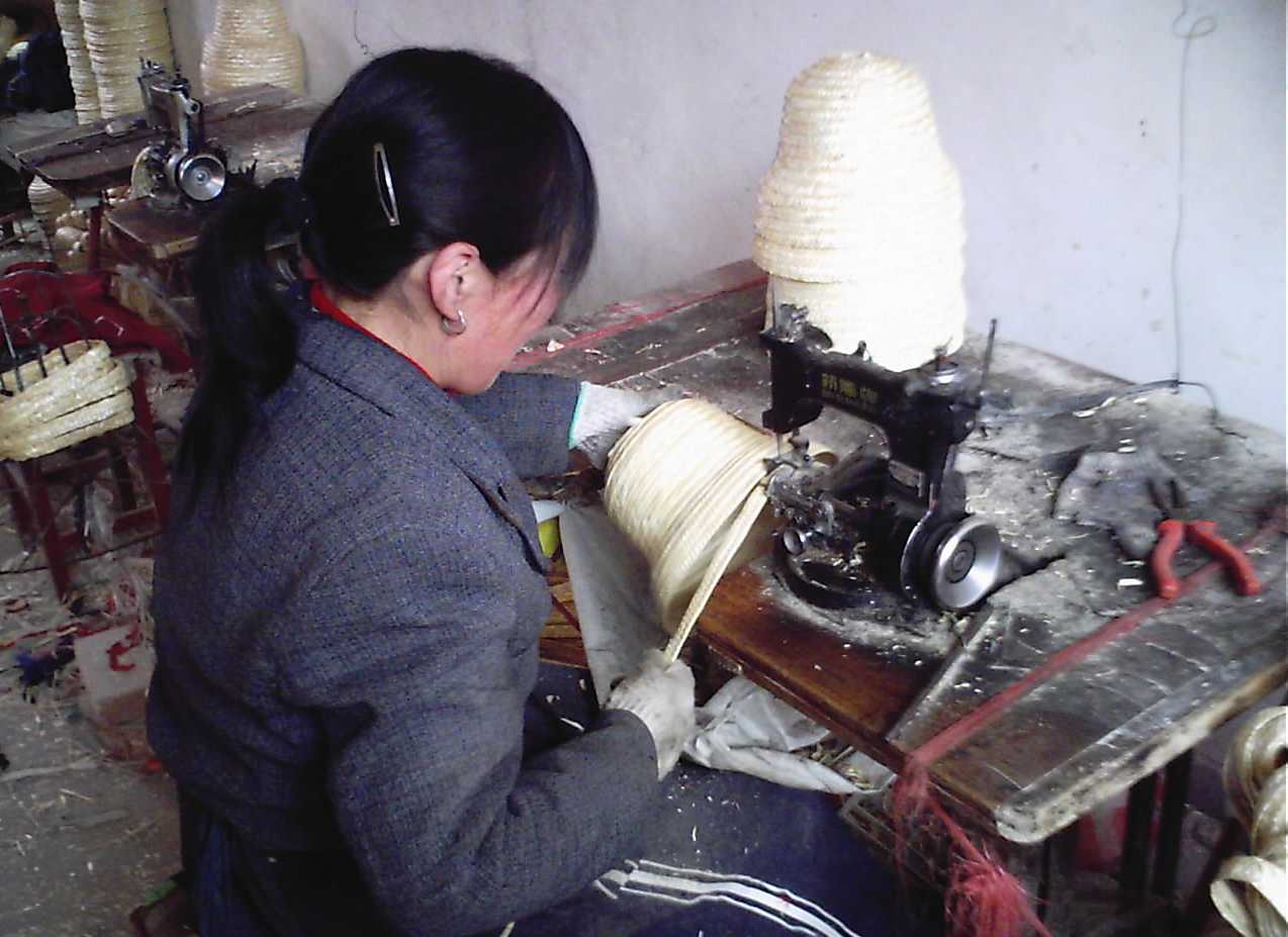 这便是加工草编的主要机器,怎么样,比较简单,很象是缝纫机吧!但它和缝纫机还是有所不同的,工人们的操作很象是缝衣服,不过一会儿,就会出现草帽的雏形。一般厂家具有十几台这样的机器,当这些机器同时工作时,从外面听,就像是一台机床在工作。