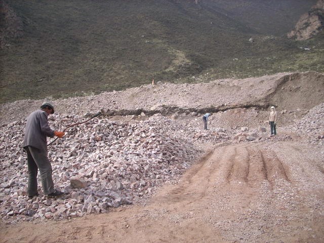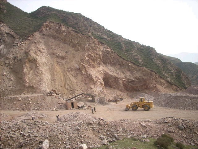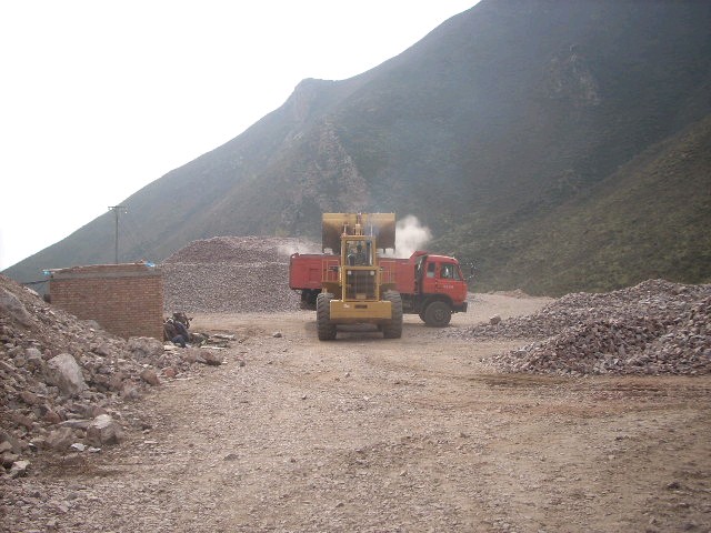 到了场地,第一眼看到的是排列整齐的大小都是三寸大的石头堆,每个石头堆跟前有工人在使劲的咂石头,因为砸的越多自己挣的钱就越多.而他们砸的石头是来自对面一座大山上,由于此场是从2001年开始开工的,所以这座大山的一半已经被开采完了,山上的石头是被管理硅石场的老板请来的炮手通过放炮把石头从山上放下来,然后,通过两台装载机把石头运输给工人的。在靠近山的一变,还有一台咬石机,它的机型和工作效率都比较大,工人工作一天,它只需要10分钟就可以完成 。