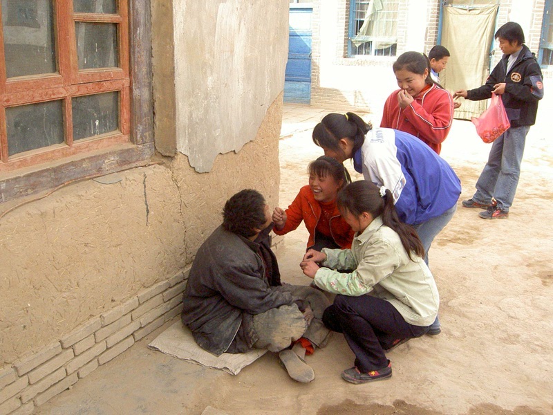 呵呵,瞧这几位女施主在做什么?真不好意思说的……我们几个女生被坐在墙角的一位"智障"老人所吸引,他总是冲我们傻呵呵地笑,我们便簇上前,剥了些瓜子和糖果逗他来吃,等他伸手来抓时,我们又迅速把手抽回来,经过了几番,他便不伸手来抓了,嘴里急得吱吱乱喊,看他可怜的样子,大家终于动了恻隐之心,便认真地喂他吃了些零食。离开老人时,我们把剩下的零食全都给了他,老人如获至宝一样,紧紧捂在怀里,依然是一幅无忧无虑的笑模样。