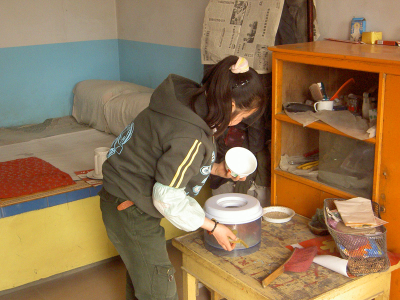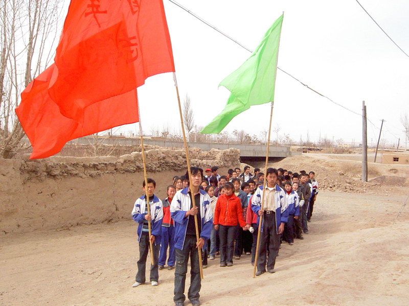 大家忙着在院落里打扫卫生或擦拭门窗,班里的"虎妞"却上了"灶".她认认真真地洗擦干净了锅碗,说是要给在外懒洋洋地晒太阳的五保户老人熬小米稀饭喝.这些老人几乎净是些没牙板板了,除了喝些粥,别的高级大餐对他们来说,只能"望洋兴叹"了,馋也没用的.画外音:"虎妞"是我班的"五保护",从小失去双亲,和奶奶相依为名吧,估计她是触境生情,所以默默地独自干这些细心活了.