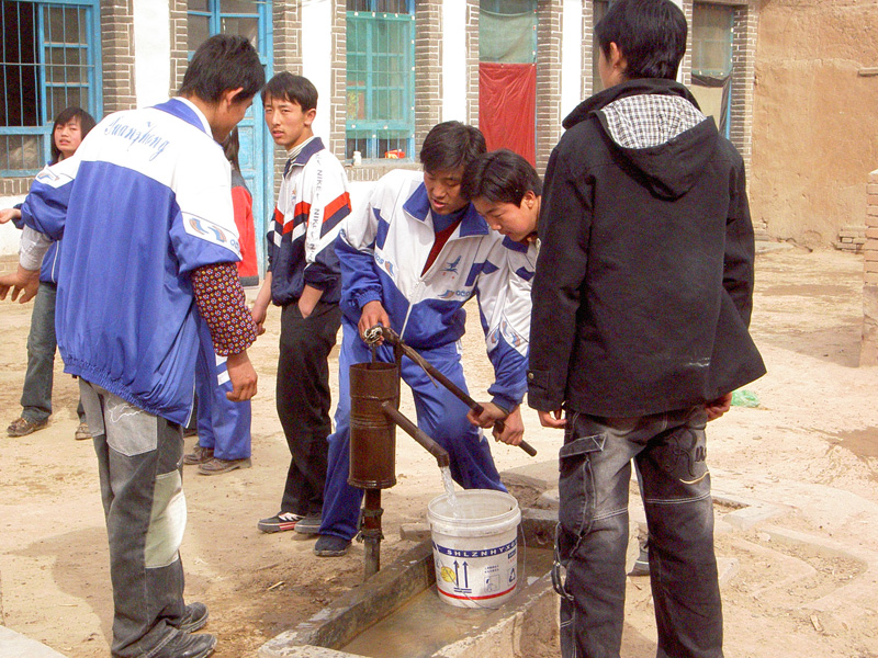 一路嬉说广笑,大约徒步行走了30分种,我们便到了敬老院.同学们大多第一次来这儿,感觉一切都挺新鲜,这望望,那瞧瞧,首先发现的是院内的手压井坏了,几乎压不上水来.班主任便发动几个男同学向敬老院附近的乡亲找来了胶皮垫、剪子、螺丝、活口扳手等工具,经过一番实战,终于把失修许久的手压井给收拾好了,看到从井嘴里欢快地奔出的"清泉",甚至有几位帅哥动情地喝了几口这井水,直喊痛快。这水啥滋味?嗨,成功的滋味呗。