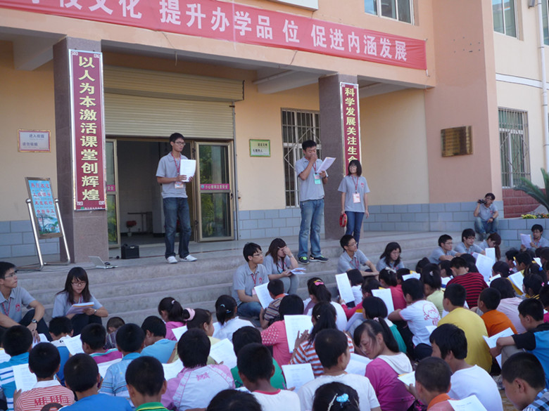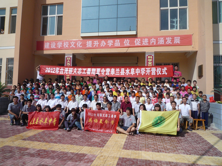 水阜中学是皋兰县"千乡万才"会员学校之一,位于美丽的如凤山下。"梦想家"夏令营开启了学生们的英语梦想之旅。台联大(台湾清华大学、中央大学、交通大学、阳明大学)的志工们提前设计了很多与学习英语有关的课程和各种小游戏。在每天早上8点至11:30的专业课上,英语口语交际能力、单词拼读和听力训练的课程设置,大大提高了学生学习英语的兴趣和积极性。在每天下午14:30至18:30的室外活动课上,"大地游戏""卫生教育""运动会""科学实验""世界博览会""成果发表"等游戏的设计,吸引学生们广泛参与进来,同学们相互鼓励,不断突破自我。志工们和学生分组玩游戏,唱歌跳舞,各组之间竞争激烈紧张又乐趣无穷。旁晚时分,志工和同学们三五一组,席地而坐,谈心交流……晚上,志工们聚到一起反思当天的教学和活动开展的得失,准备隔日的教学和活动。不管是烈日当头,还是刮风下雨,志工们上课从来都是提前到场,每次晚饭总是一拖再拖。