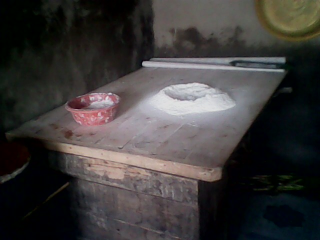 步骤二:把已发酵的酵面加少许面粉和好,到不黏手的时候就可以了,切成一样大小的面团,不要太大,把面团压扁,这样面皮就好了,里面放上馅儿,像传统包子一样捏好,再压扁,不要像面皮一样扁。第二步就完成了。