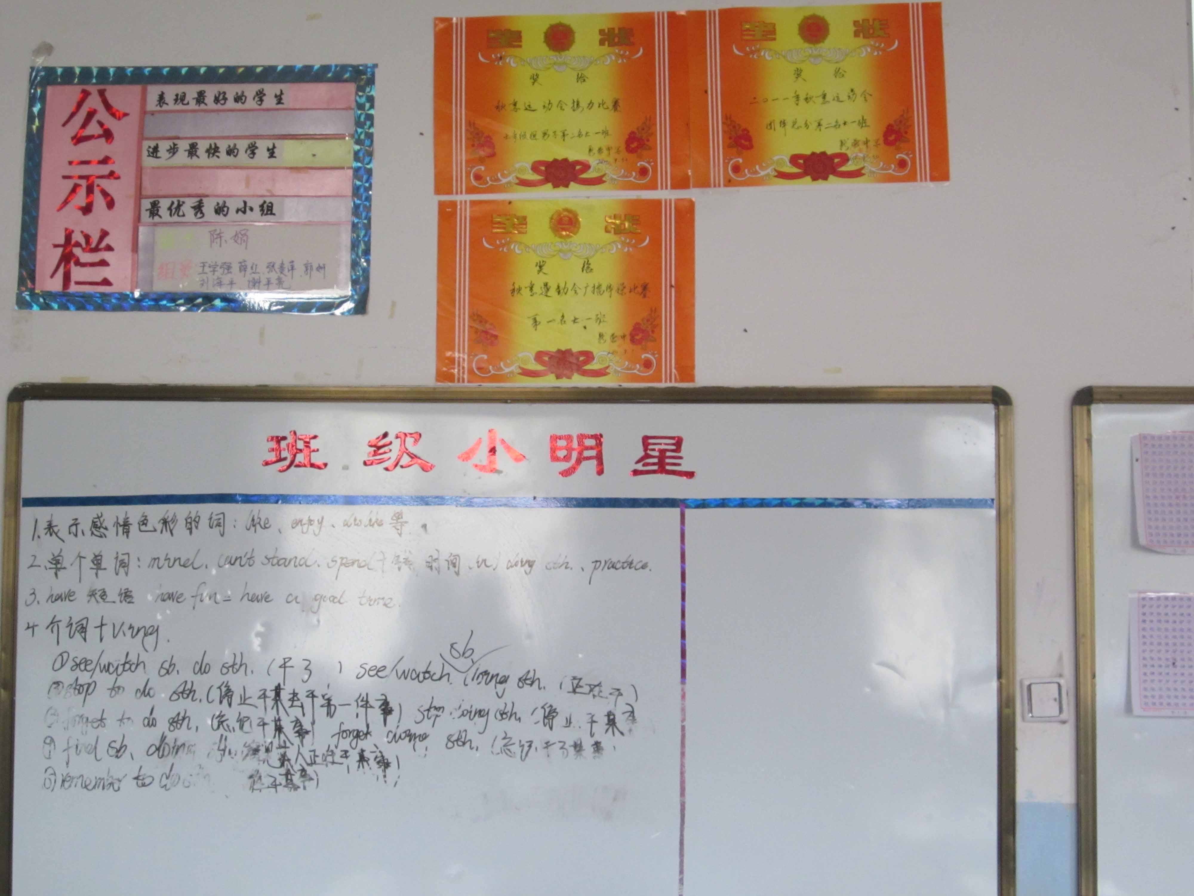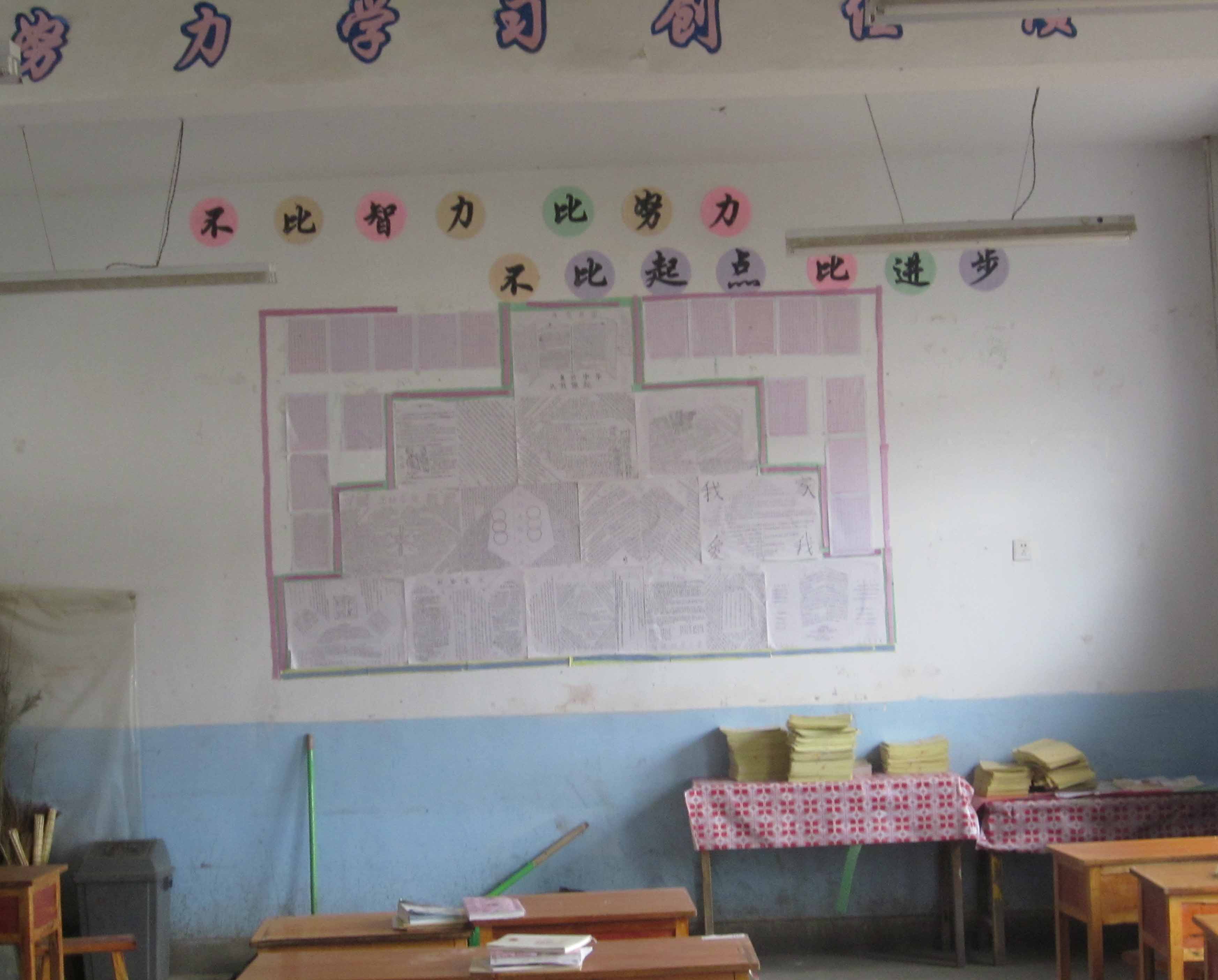 转过头来,看看我们的墙壁,最耀眼的便是三张奖状,这是我们班在运动上取得的辉煌成绩。这是每一位同学用汗水换来的。每当看到它们,我们的心灵便会得到安慰。再回头,“八荣八耻”教导着我们如何做人。在最后面,那是我们的学习园地,在正上方挂着我们的座右铭“不比智力比努力,不比起点比进步”。在下面是同学们用双手和智力创办的作品展览区,每一件都是别出心裁,与众不同。