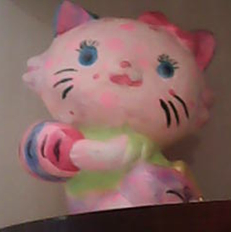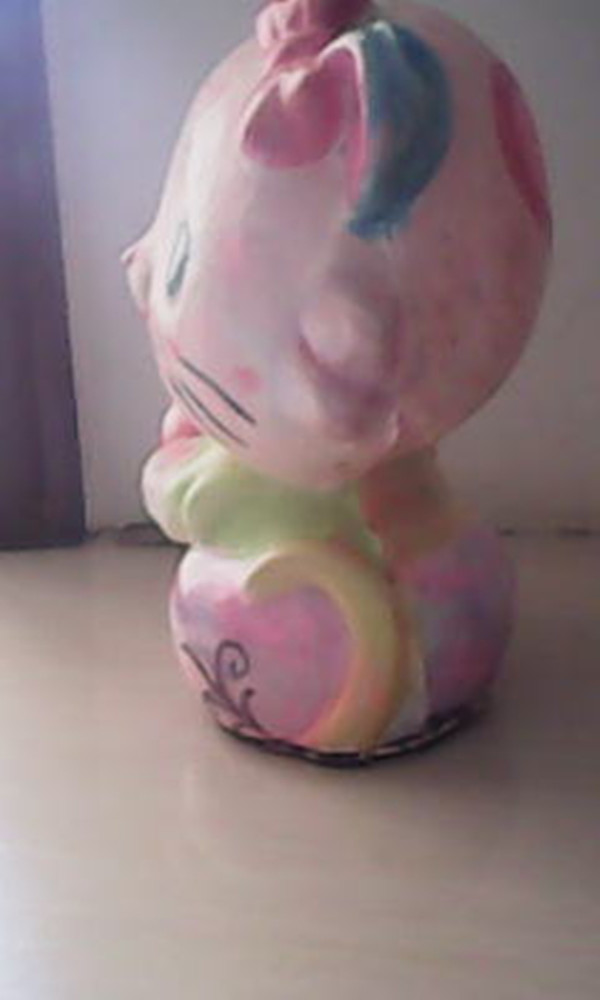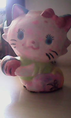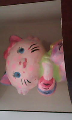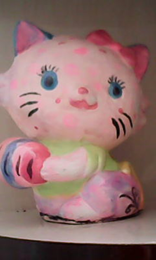 我家有一只小花猫。你可别以为是真的,其实她是用石灰做的!假猫咪。是我亲手打造的。她的脸是淡粉色的,上面有玫瑰色的圆点,耳朵正面是粉色的,前面是蓝色的,还戴着一个粉色的蝴蝶结,蓝色的大眼睛,长长的、黑色的睫毛,红色的小鼻子和嘴巴旁还有几根胡须。