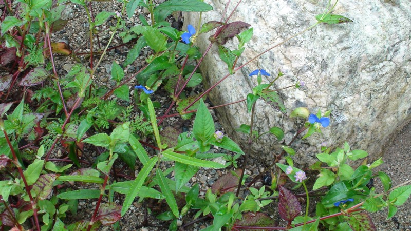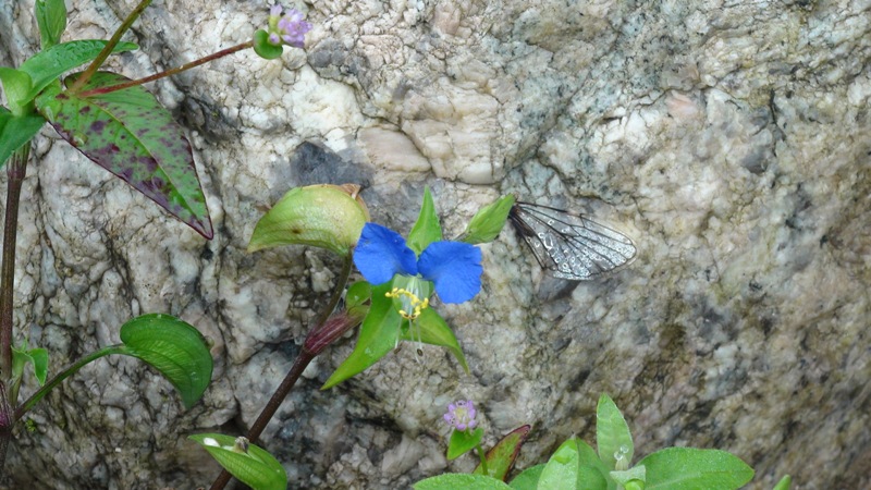 在路边的一块大石头边,生长出一株蓝色的花,花虽小,却散发出阵阵花香,你瞧,它还吸引了一只蜻蜓来了呢。