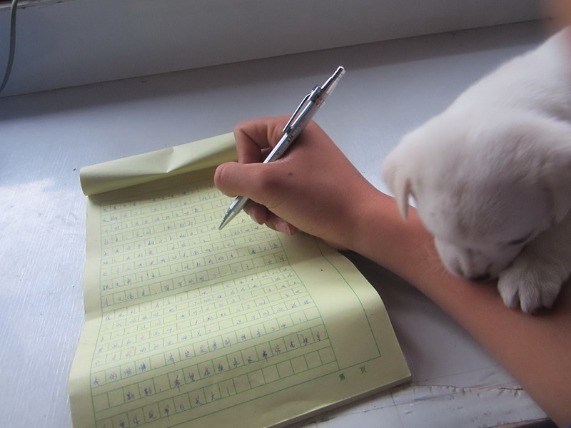 吃过后,我来到书桌前写作业。这时,勒勒却一下子窜上来,把书翻来翻去的玩,忽然又跳上我的背,也不知道是我的笔影响了他,一个跟头栽下来,咬起了我的笔,我有气又好笑,吸了一口气,也许感觉到了我生气了吧,他乖乖的趴在一边,看着我写。正当我写完作业,想抱起他高呼万岁时,他却睡着了。还不时的舔舔嘴巴,肯定是想母乳了!