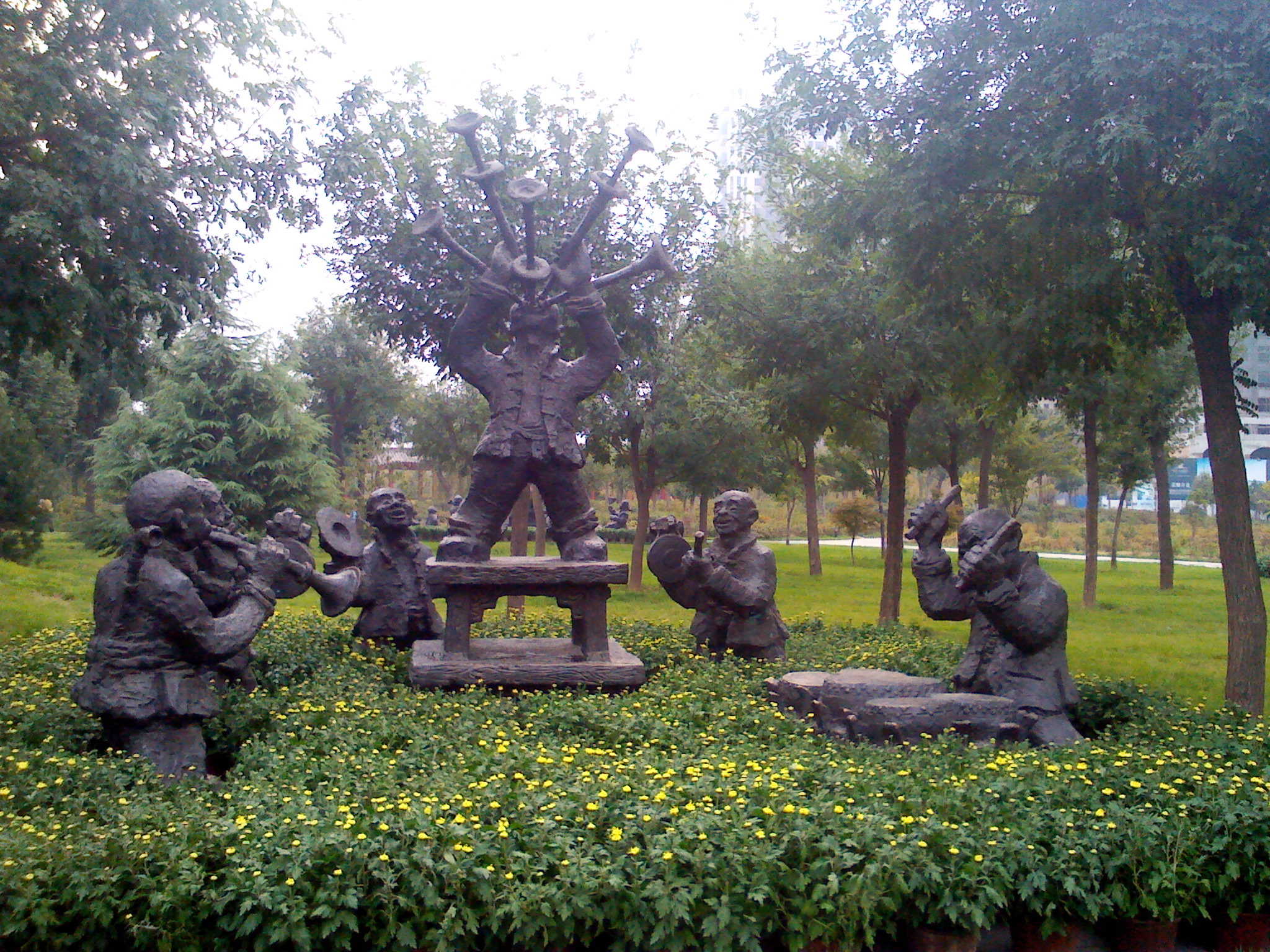 朝阳公园里还有很多铜人,他们都是陕西的民间艺术反映。铜人的四周也围满了漂亮的黄色菊花,铜人们神态自然,惟妙惟肖。