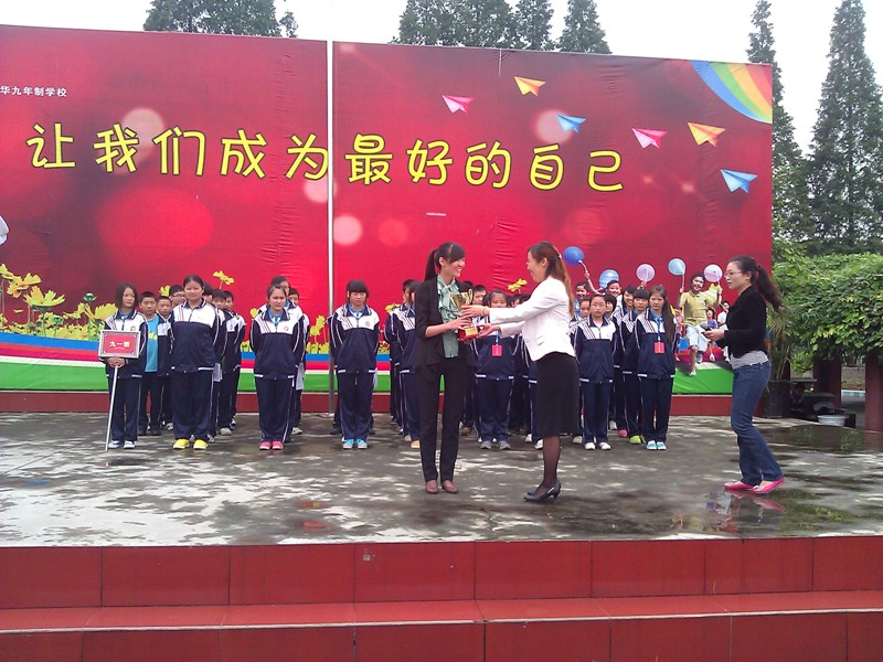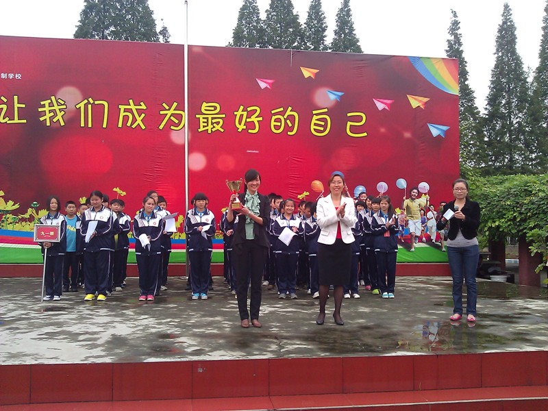 接下来,让我感觉到最幸运的是,我们居然沾了袁老师的光,再次享受了全校师生的掌声。袁老师是刚来我们学校的,她参加了县级网球比赛,获得了第二名。詹校长为她颁发了奖杯,全校师生为她送上了祝贺的掌声。