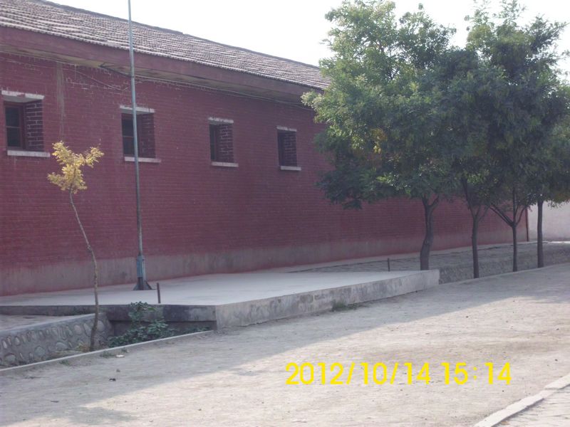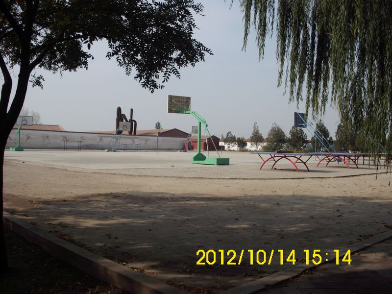 操场是圆形的,还有圆形的跑道。正中央是一个排球场,站在排球场上,松树后面的墙面上画着各种体育羡慕,有跑步的有跳远的……南部是主席台,主席台上正中央立着一根旗杆,主席台两旁是槐树,到每次集会时就会有领导老师在上面讲话,往东走会看到教师的宿舍。