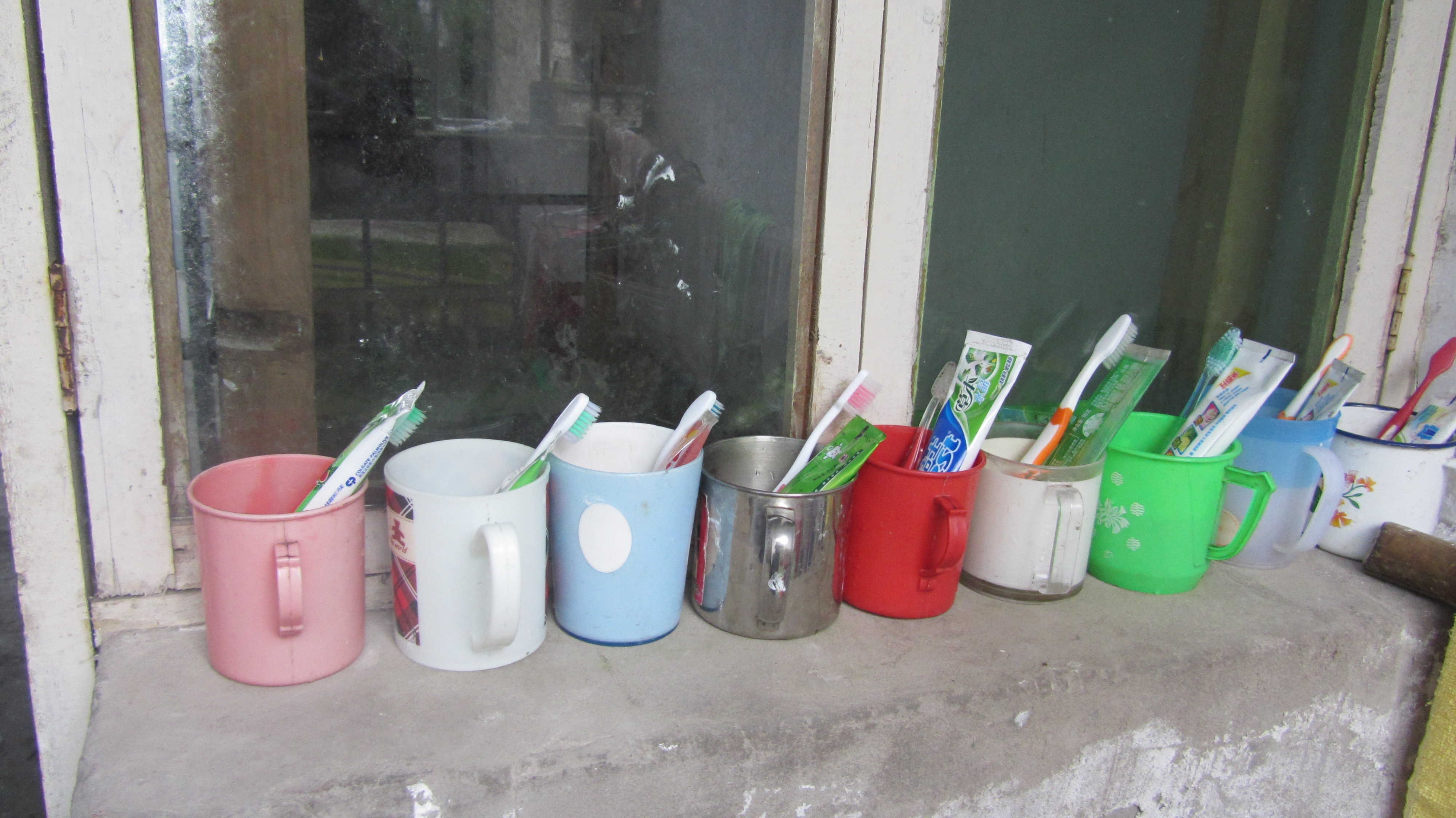最后来看看这里,这个小小的窗台被我们充分利用放上了大家的牙刷杯子,很整齐吧,方向一致代表着我们9个女生会同心协力,团结互助,继续我们的快乐生活!我爱我们的寝室!