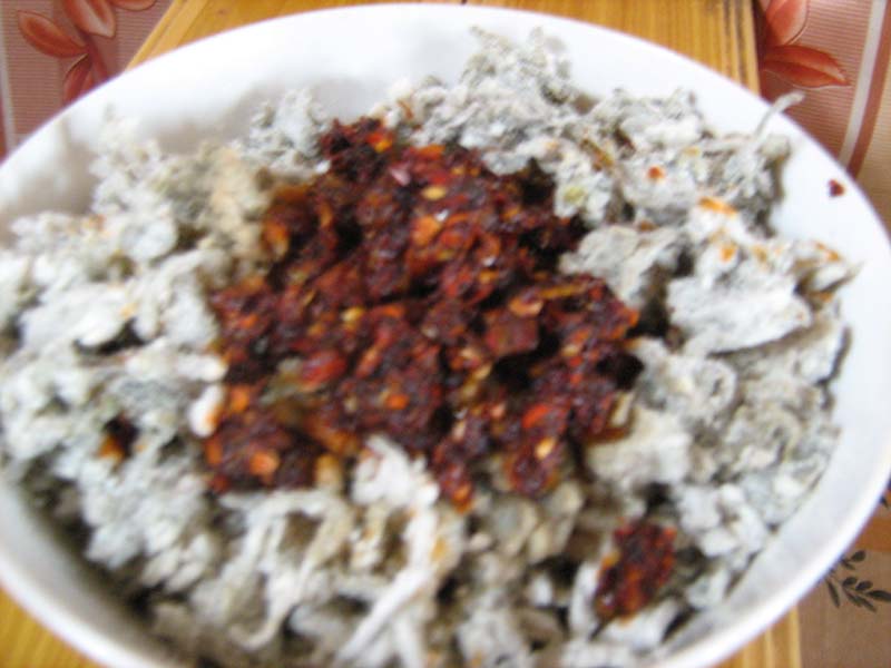 吃野艾时,根据个人的口味可以调不同的作料。先调一些香油,再加上一些白砂糖拌匀,吃起来干爽香甜;也可以调一些醋,再加上一点蒜泥拌匀,吃起来酸涩可口;还可以直接调一些炸好的辣酱,尖辣爽口,煞是好吃。
