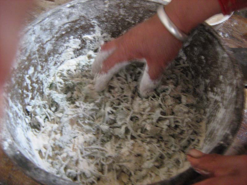 蒸制野艾前,在刚冲洗好的野艾上撒一些面粉。一定要在野艾潮湿没干的时候撒面粉,否则面粉粘不到野艾上就不好吃了。边撒面粉还要边用手抄,使野艾上都沾有足够的面粉,这样口感会很好。拌好面粉后就放到蒸锅里蒸30分钟,野艾就算蒸制好了。