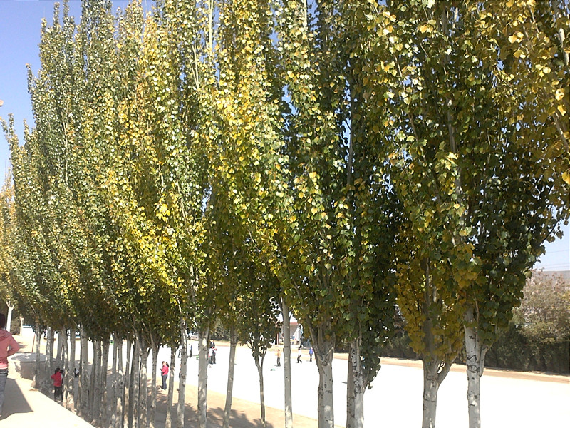 操场里有一排高大的白杨树,听老师们说那些白杨树已经有好几十年了,但是长得都不是很粗,我想是因为我们这里缺水的缘故吧。白杨树虽然不粗壮,但是很笔直,就像是一个个哨兵一样站在校园里,陪伴我们学习、玩耍。秋天到了,白杨树的叶子开始变黄、脱落,就像是一只只彩蝶在飞舞。