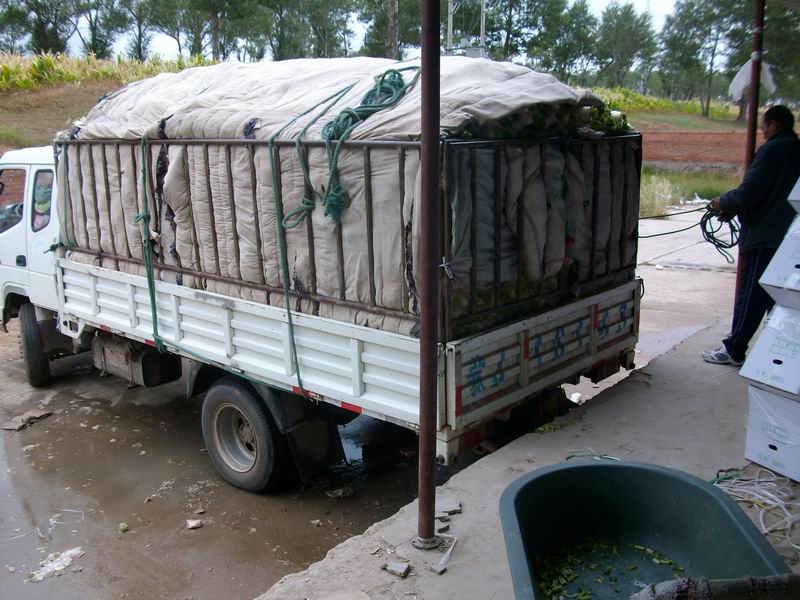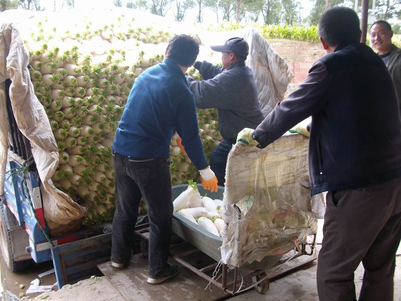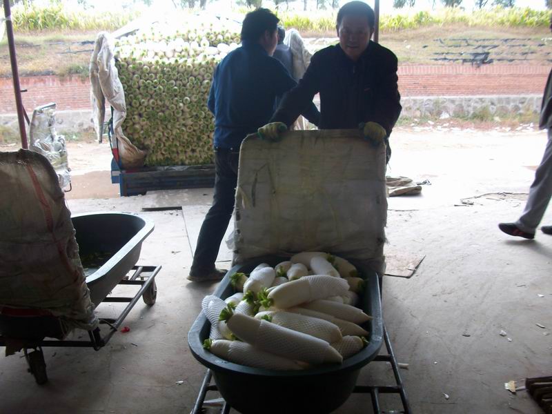 这位叔叔是专职"司机"。听说他还真是一位开大汽车的司机,因为他们养车主的活不景气,只好回本地打工,当一名手推车"司机",真有点委屈了才干。他把一盆盆萝卜迅速地推进冷库,推出空车,再推装好的下一车萝卜,循环往复。别看是一盆萝卜,这种小车其实并不好开,掌握不好方向,进冷库的小门还真没门儿。