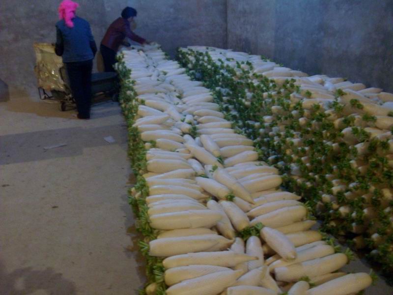 妈妈和一位婶婶干这一道活。萝卜推进了库,她们先把冷库的地上铺好塑料薄膜,打好底把萝卜摆在上面,要求头对头垒成墙的形状,不能垒得太高,萝卜墙之间有空隙,因为这样容易打冷。冷库里不停地在打冷,温度在零下10度,干活时必须多穿点衣服。你想,整个秋天一直在冷库里做活,身体能承受得了吗?妈妈干活,我看在眼里,我真心疼!