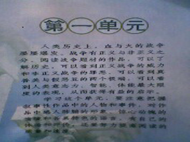 第一单元第一课是两篇新闻,那几百万战士不怕牺牲,不怕吃苦。他们为了我们的国家,为了人民,英勇愤敌的跟敌人血战到底,这些战士都值得我们尊敬。老师给我们讲的每一句话、每一个字,都记在了我的书上。